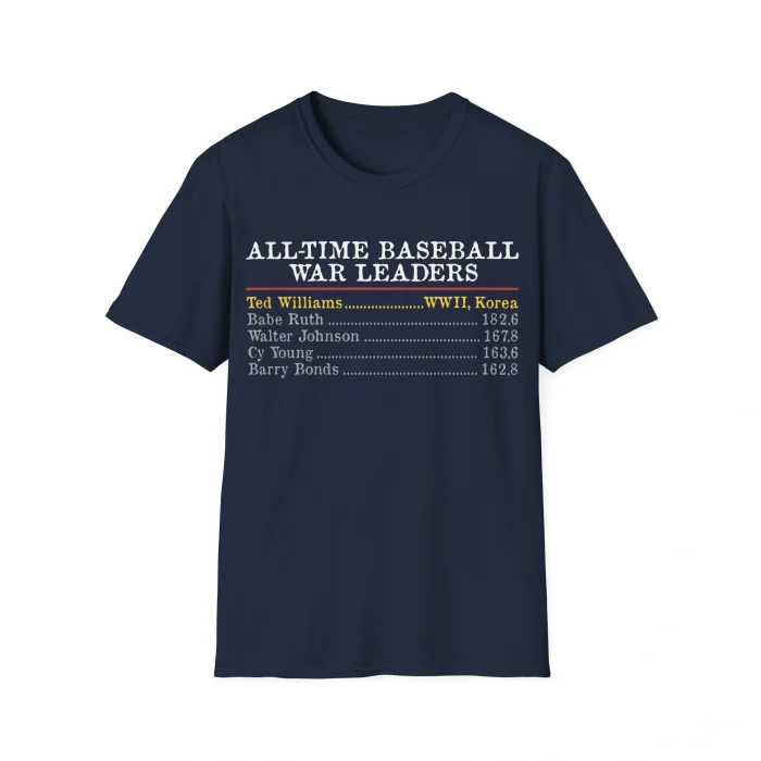 Front and center sits Ted Williams, highlighted at the top of the list — and not by accident. The design brilliantly reminds everyone that Williams served in WWII and Korea, missed years of his prime, and STILL finished with the highest WAR of all time. Below him, the icons of baseball — Babe Ruth, Walter Johnson, Cy Young, Barry Bonds — fill out the stat sheet, proving this shirt isn’t just for casuals.