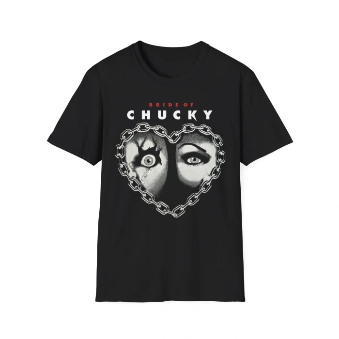 The shirt features an eerie Bride of Chucky graphic, framed inside a chain heart that highlights Tiffany Valentine’s iconic doll eye alongside a chilling human eye. Printed in sharp black and white on a deep black cotton tee, the artwork captures the unsettling vibe of 90s horror while keeping it modern. Whether you’re a fan of Chucky, Bride of Chucky, or just want a spooky look for the season, this shirt nails it.