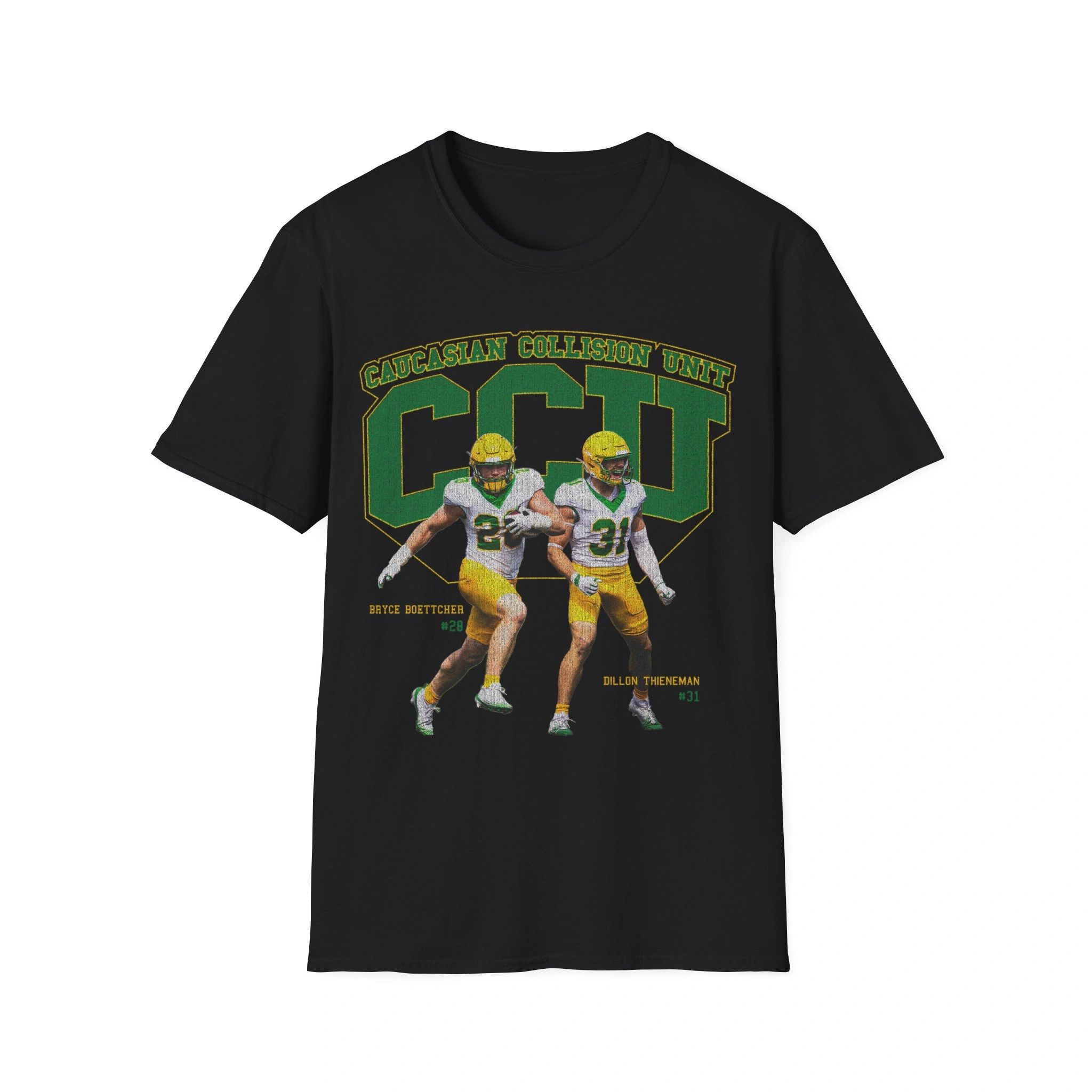 The shirt features their self-anointed nickname: the CCU, or Caucasian Collision Unit. It’s a hilarious, self-deprecating nod to the hard-hitting playing style of the two defensive stars, who have become fan favorites in Eugene for their grit, hustle, and bone-crushing tackles.