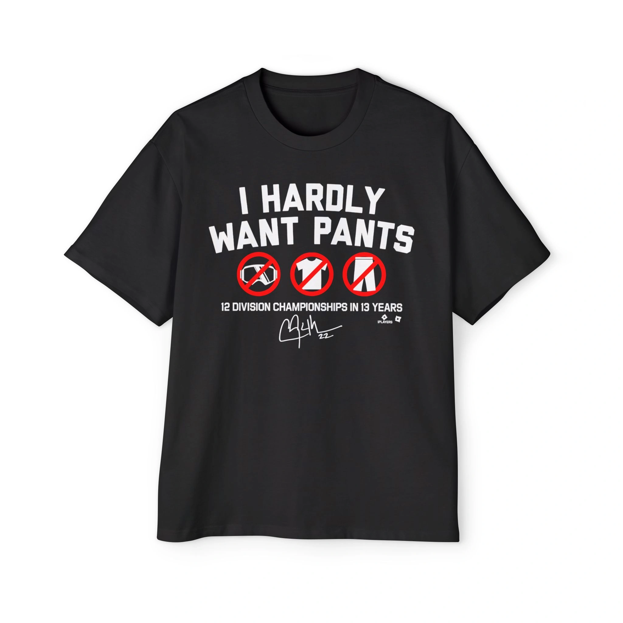 On the front, the shirt features the striking phrase “I Hardly Want Pants” in all caps, printed in crisp white over a bright blue base. Beneath the text, symbols of pants with red strike-through signs drive the joke home while also showing Hernández’s irreverent, fun-loving personality. Below the graphics, the shirt proudly displays: “12 Division Championships in 13 Years” with Kiké’s signature printed underneath. It’s the perfect mix of comedy, confidence, and baseball history, turning an inside moment into a collectible tee.