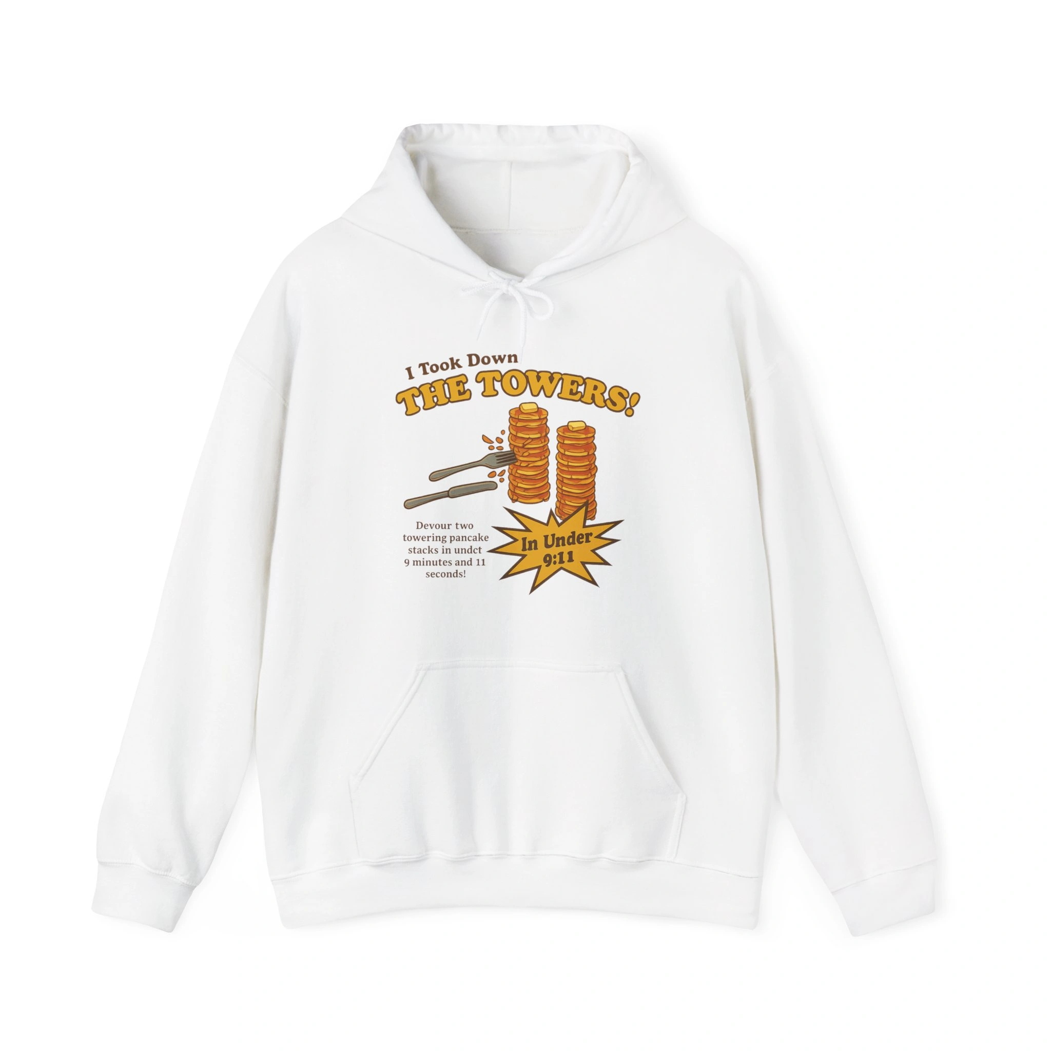 The I Took Down The Towers Pancake Shirt is a fearless entry into the world of meme fashion. This isn’t just a tee—it’s a parody design that turns dark humor into a loud cultural statement. With retro diner-style artwork, it shows two towering stacks of golden pancakes under the bold slogan: “I Took Down The Towers! In Under 9:11.” A playful tagline dares the wearer to “devour two towering pancake stacks in under 9 minutes and 11 seconds.”