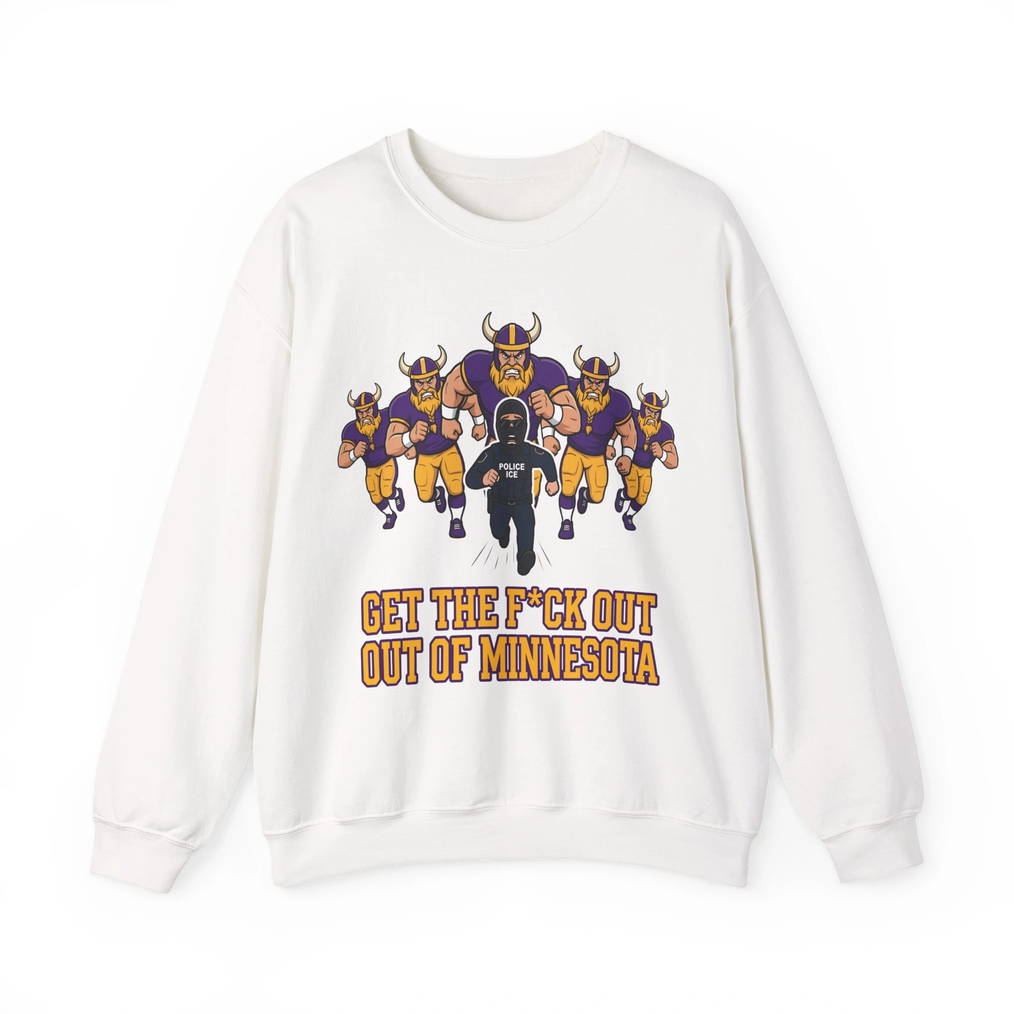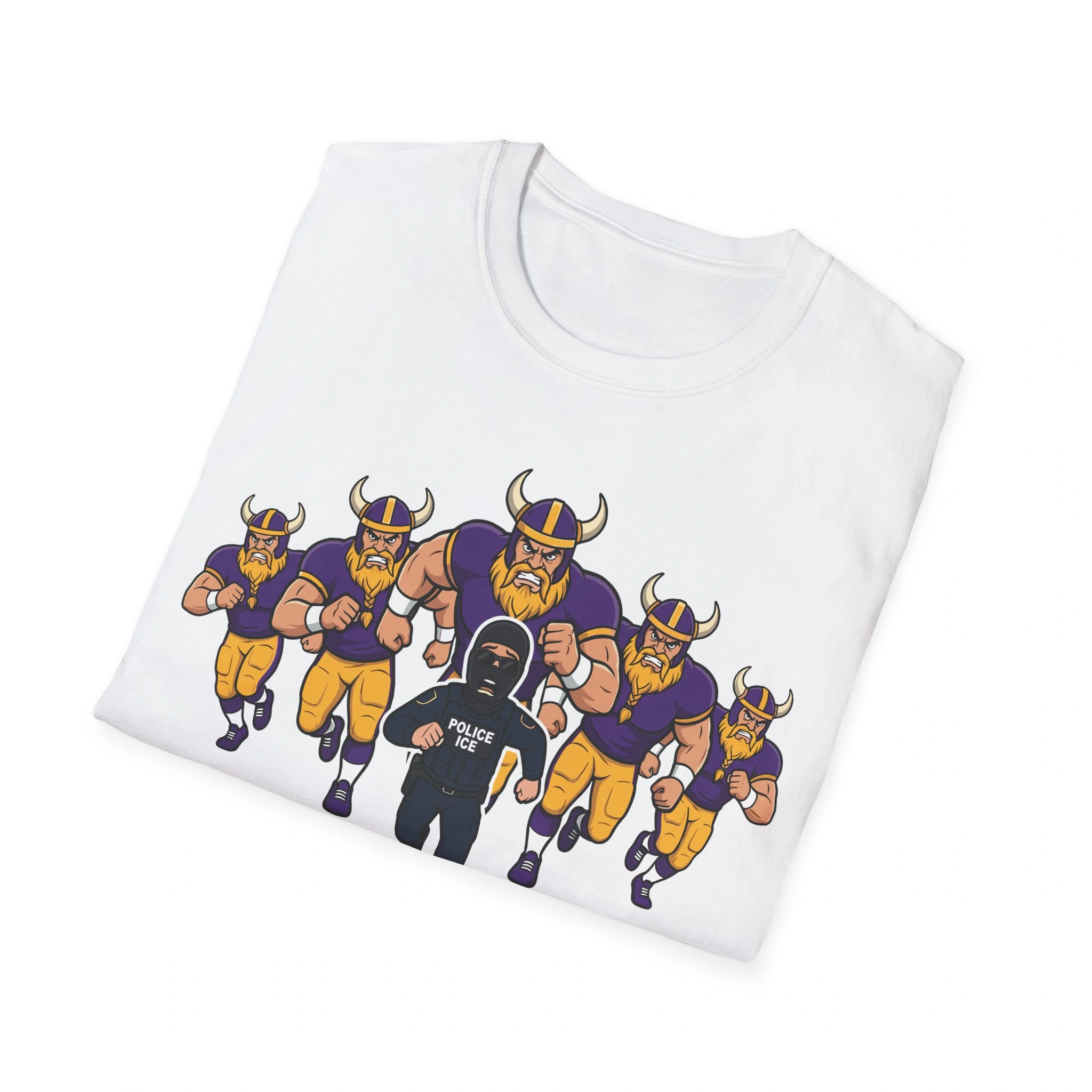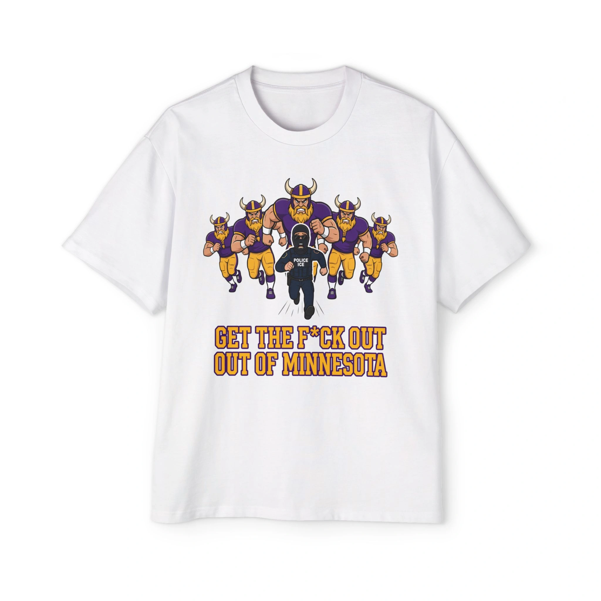 The Imagery: Many versions of this viral design feature a graphic of Minnesota Vikings-style figures chasing an ICE agent, a satirical nod to the “Vikings vs. ICE” memes and the fierce local pride defending its residents.