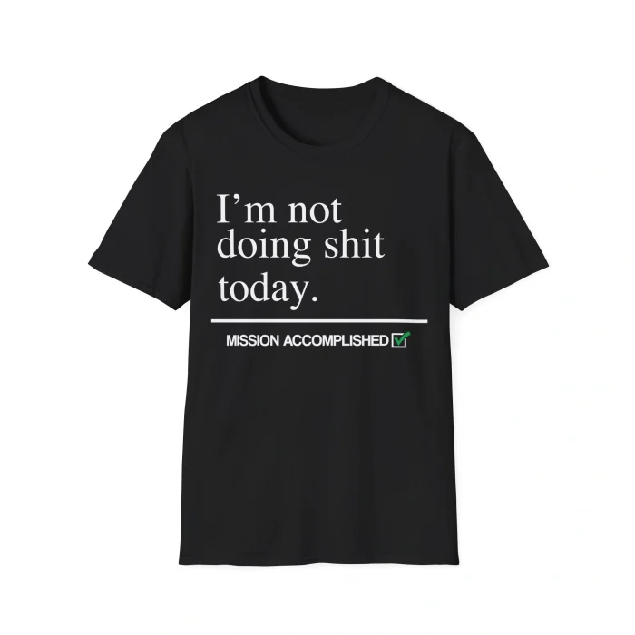 The design is as straightforward as its message: clean white text across a solid black background that reads I’m not doing shit today.”* Beneath it, a cheeky progress bar-style line with the phrase Mission Accomplished and a small green checkmark seals the joke. It’s humor done right — no over-design, no extra fluff, just a statement that lands every time. The combination of bold simplicity and dry wit makes it an instant fan favorite.