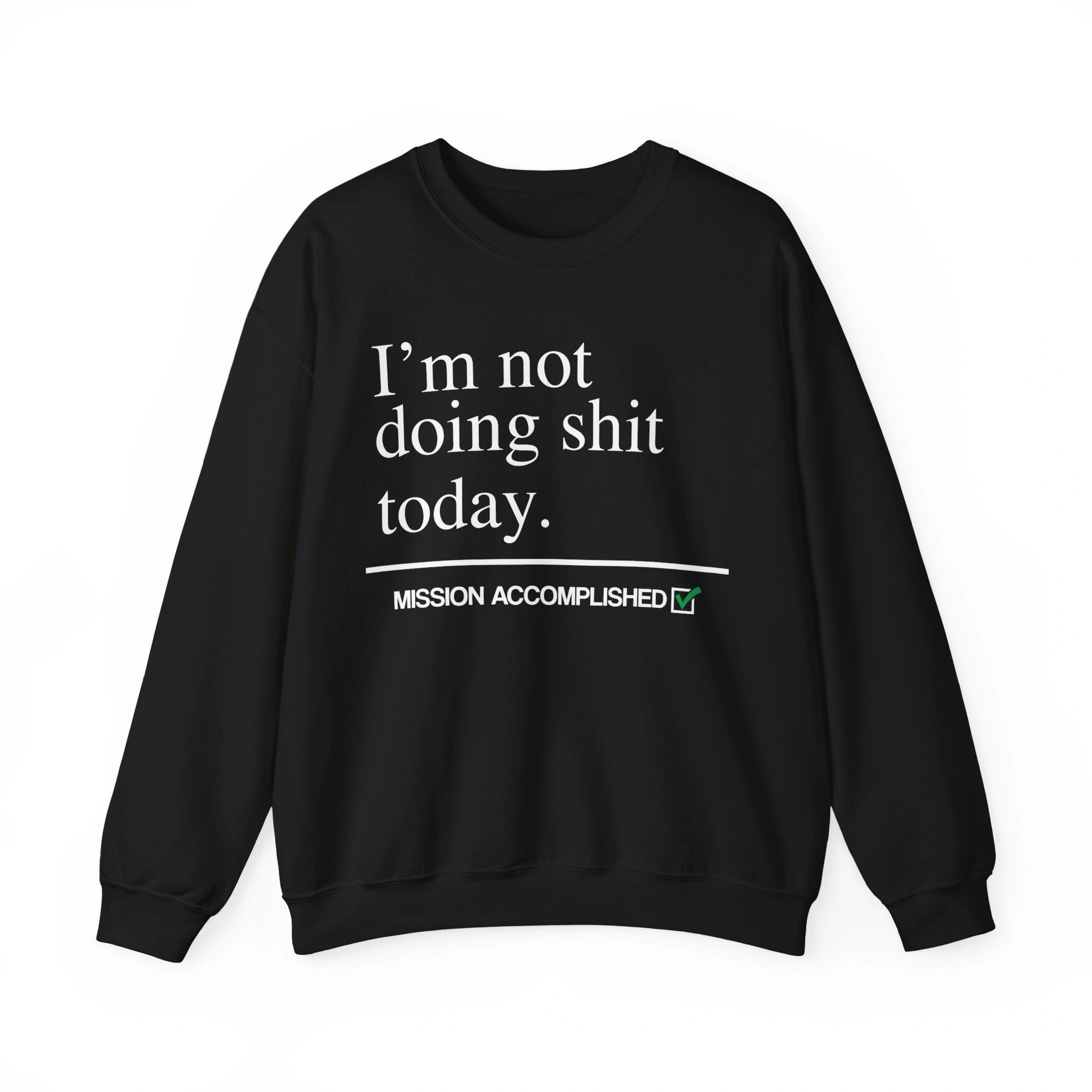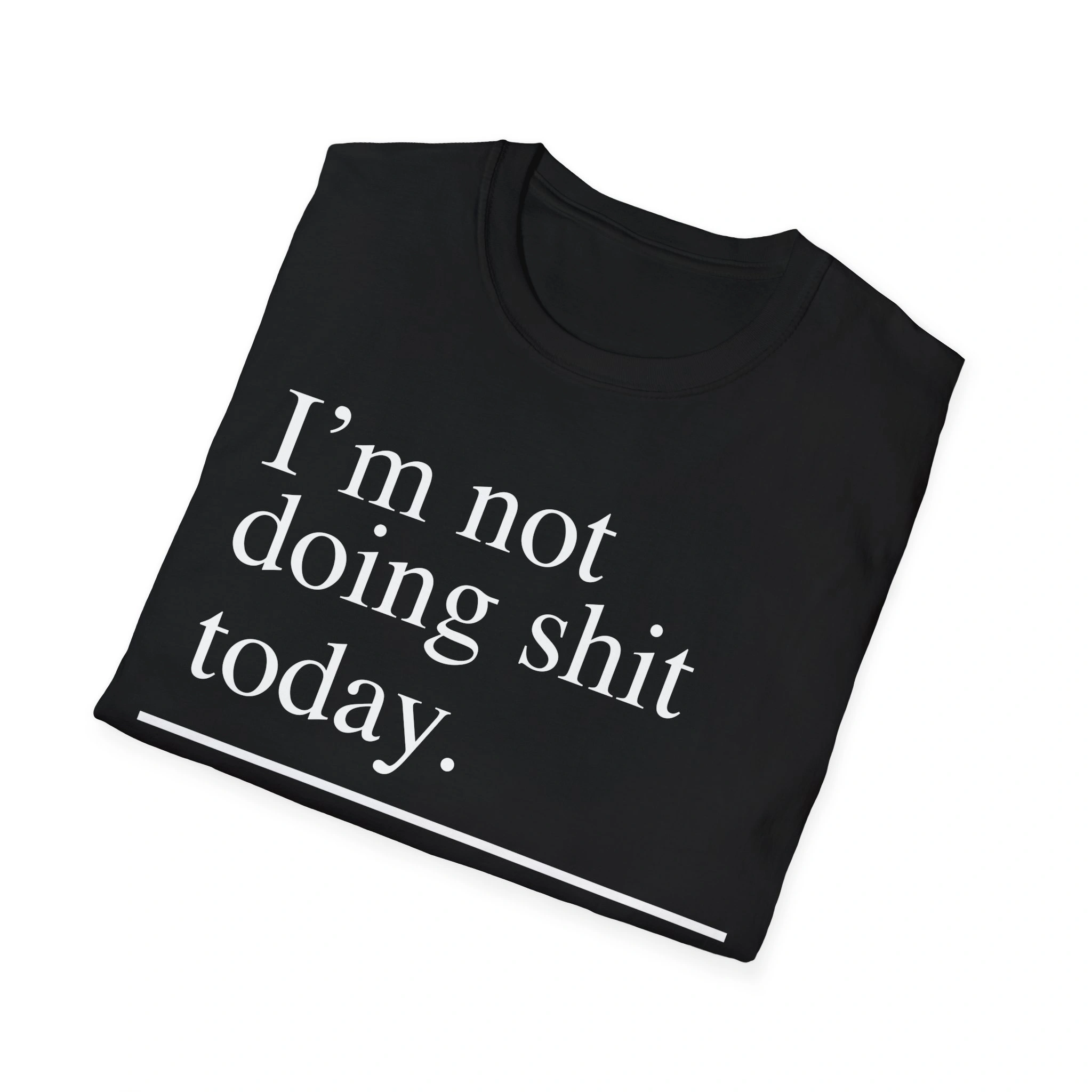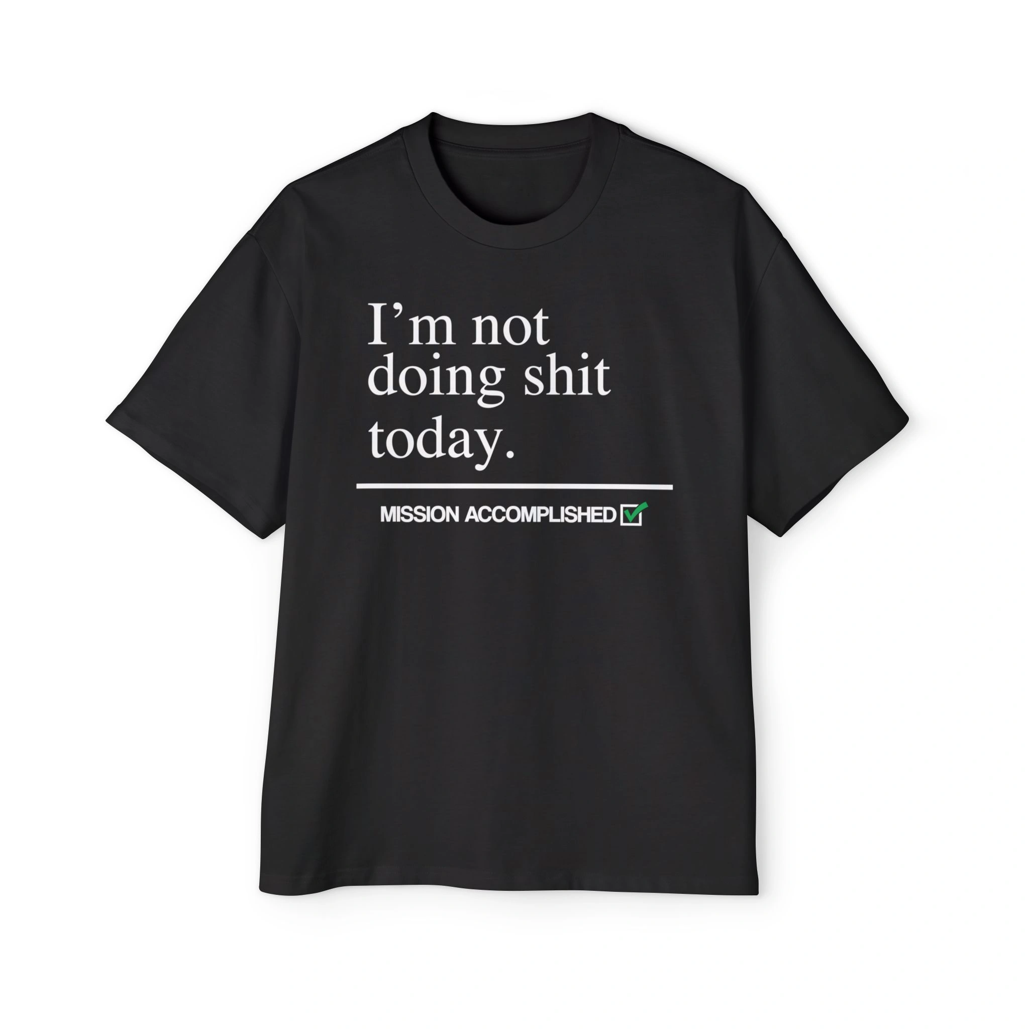 The design is as straightforward as its message: clean white text across a solid black background that reads “I’m not doing shit today.”* Beneath it, a cheeky progress bar-style line with the phrase “Mission Accomplished” and a small green checkmark seals the joke. It’s humor done right — no over-design, no extra fluff, just a statement that lands every time. The combination of bold simplicity and dry wit makes it an instant fan favorite.