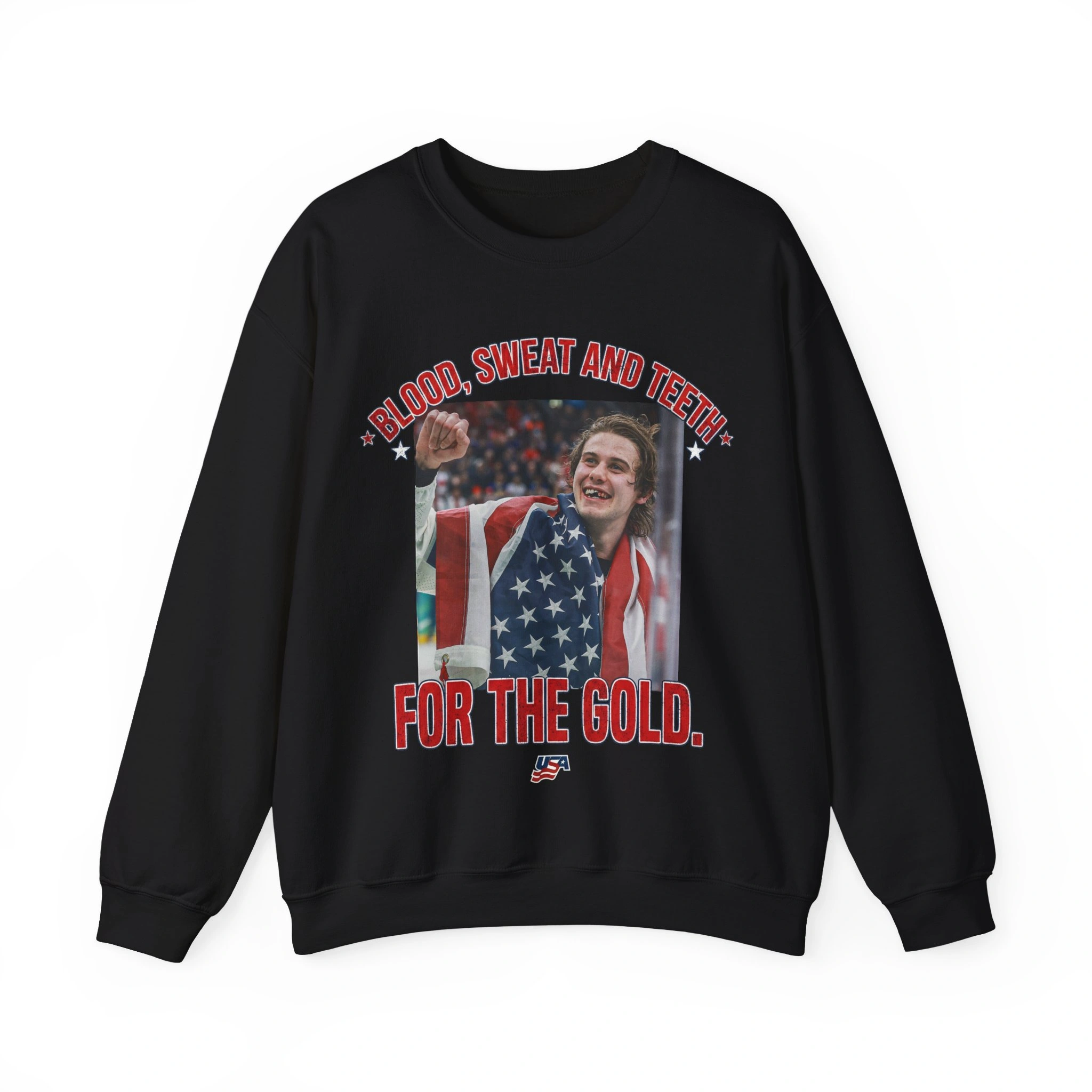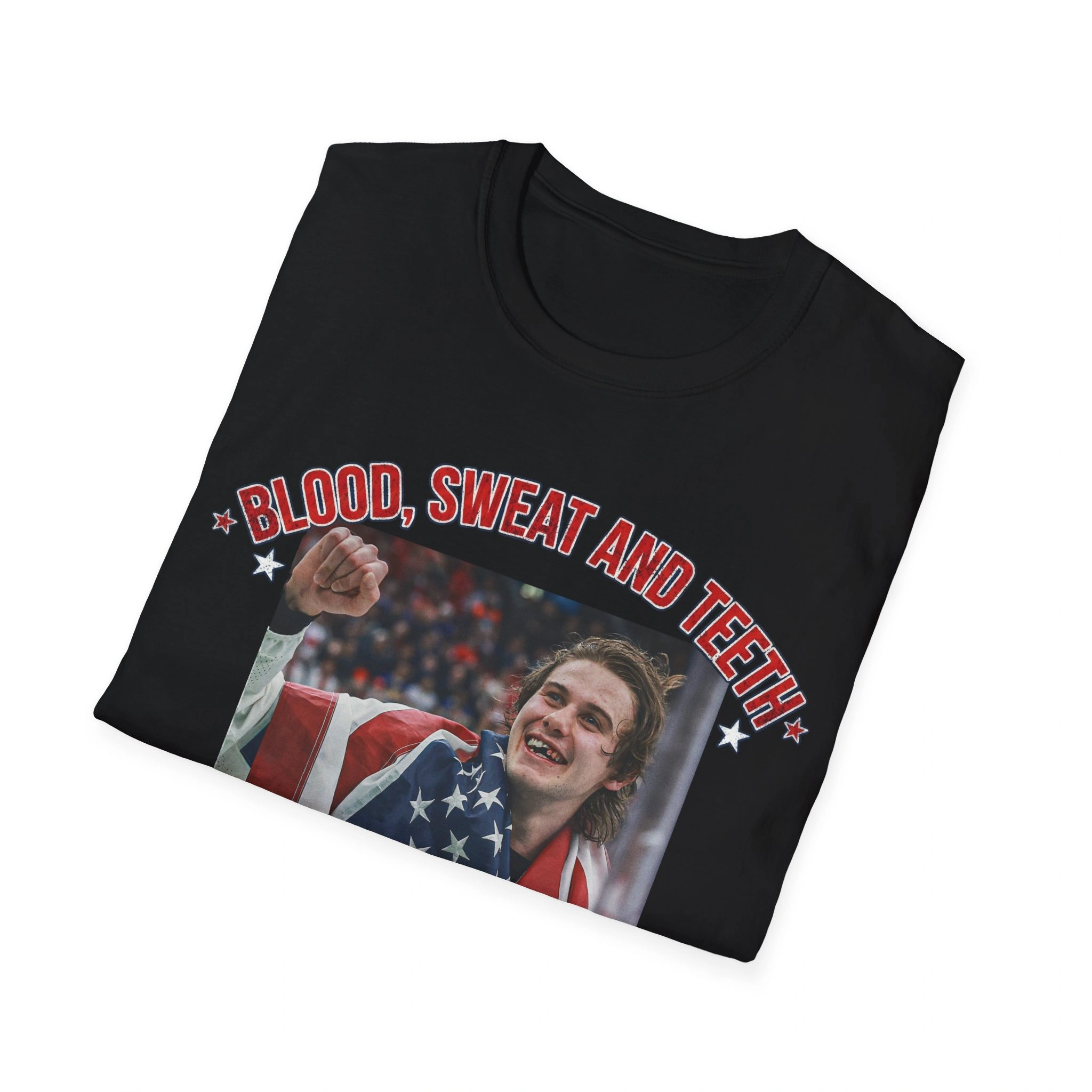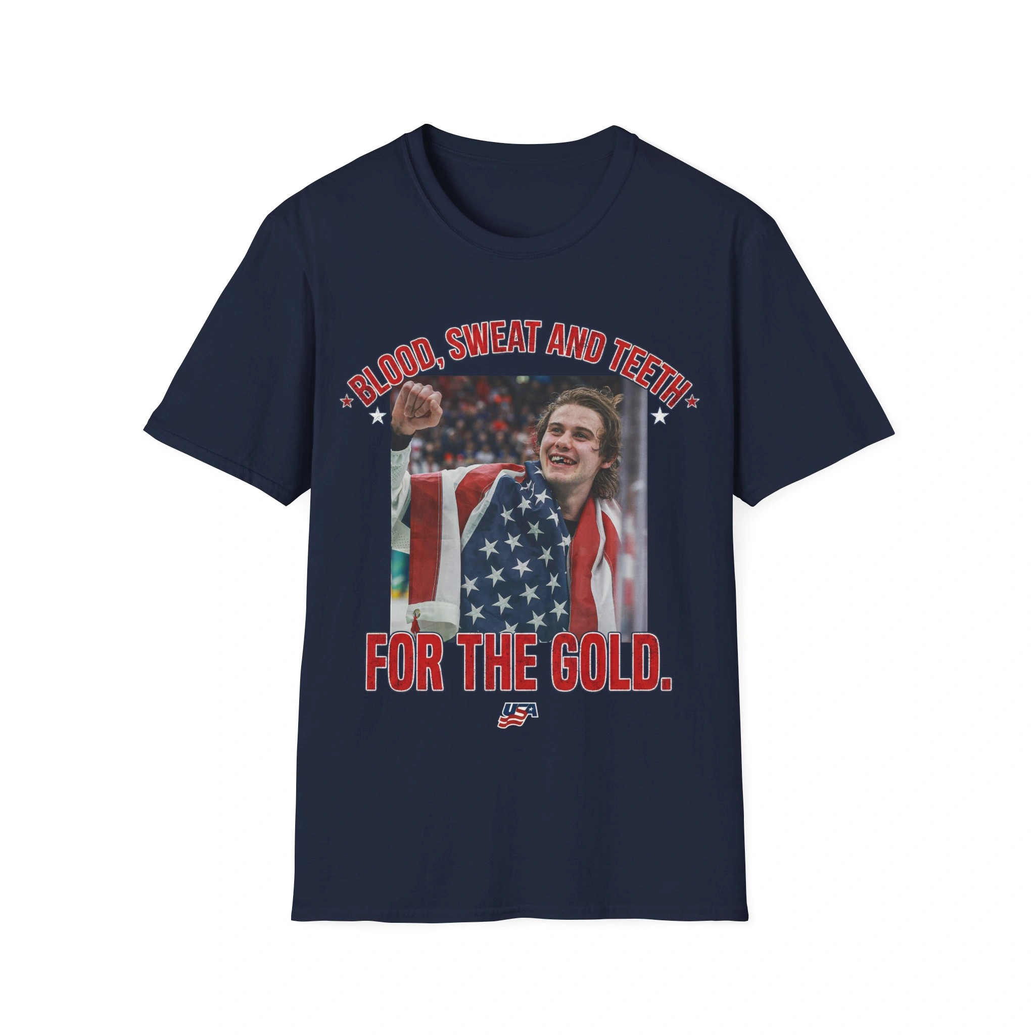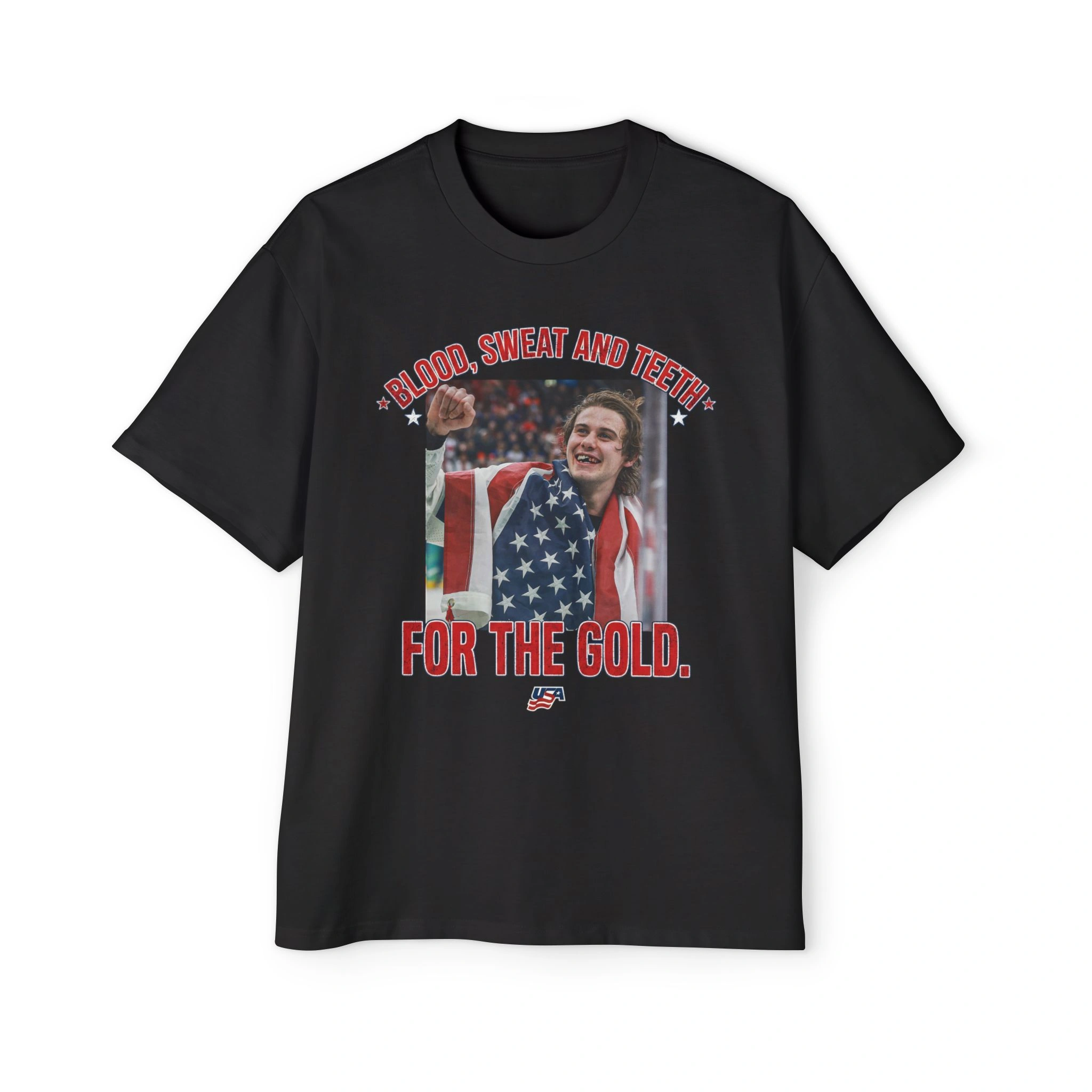 This design immortalizes the viral post-game moments where a grinning, bloodied, and toothless Jack Hughes told the world how much he loved his country and his teammates.