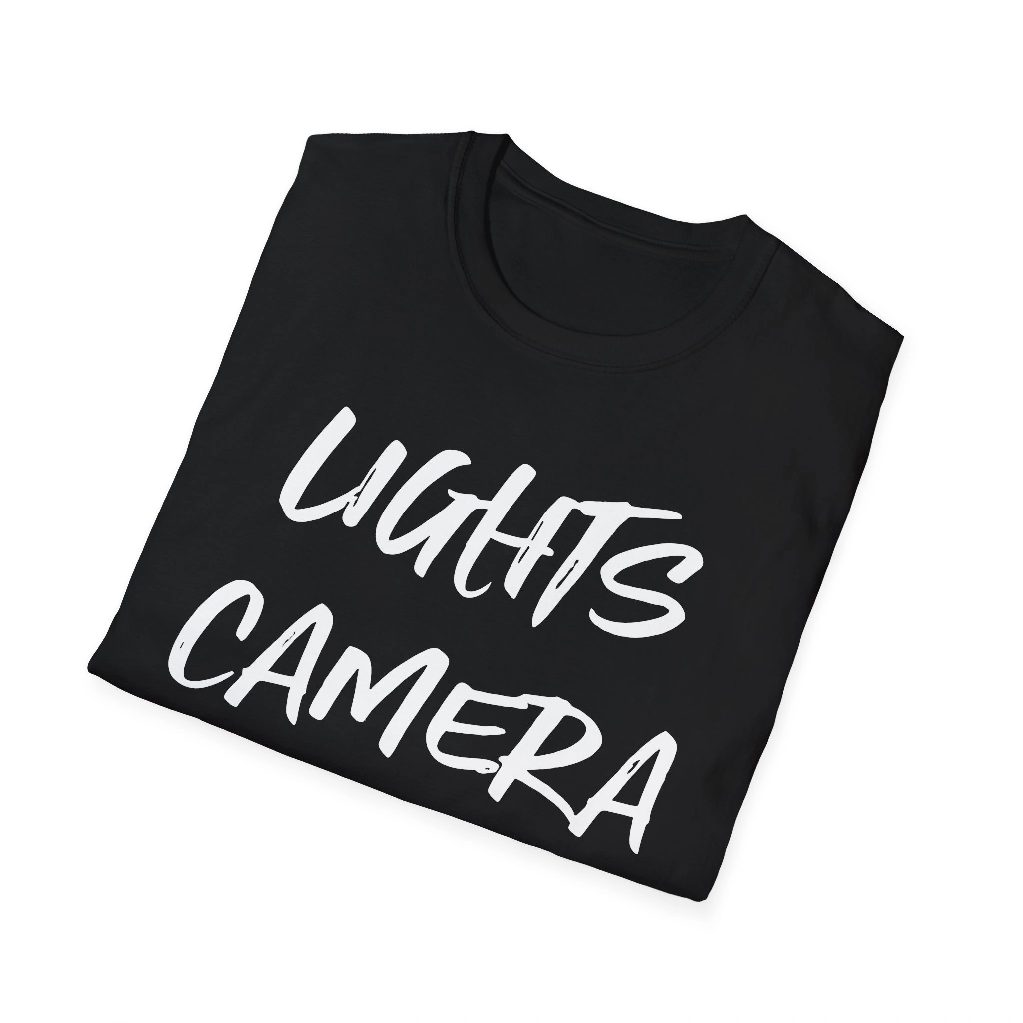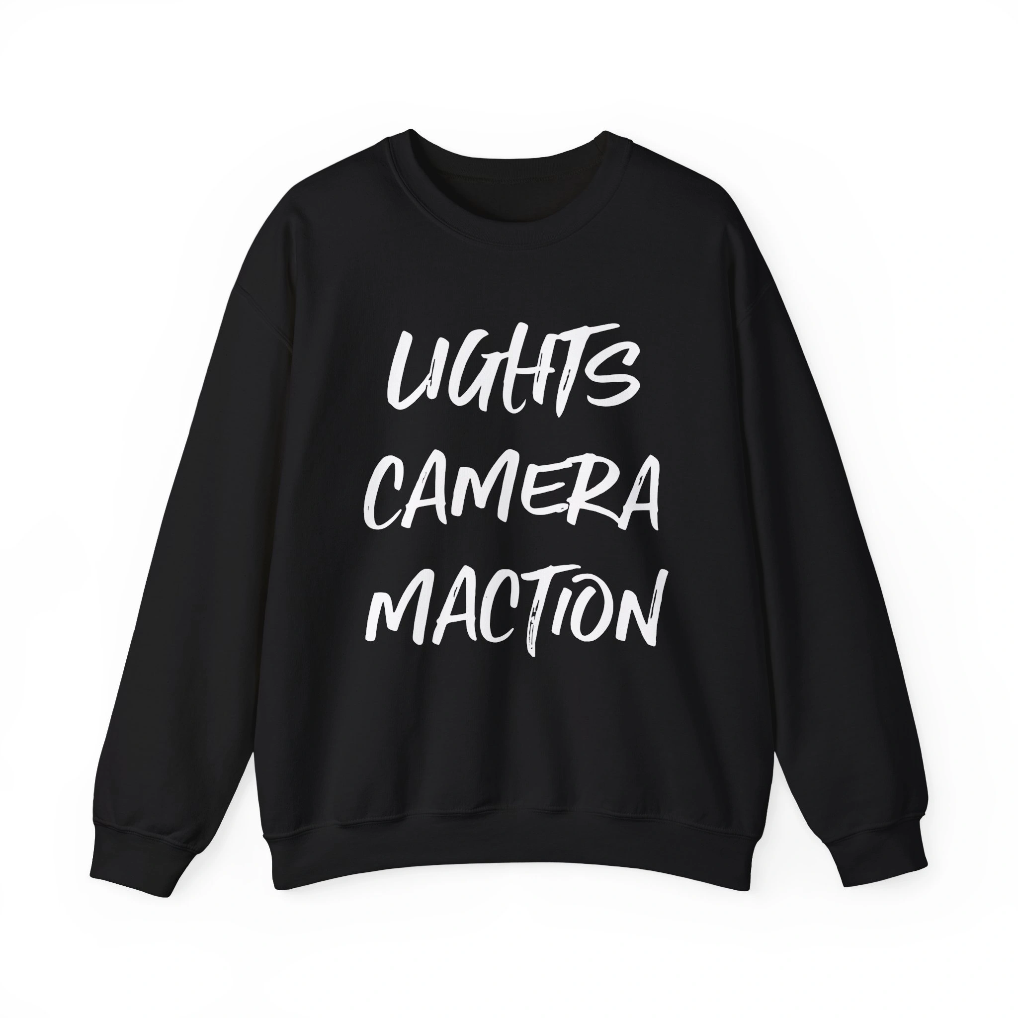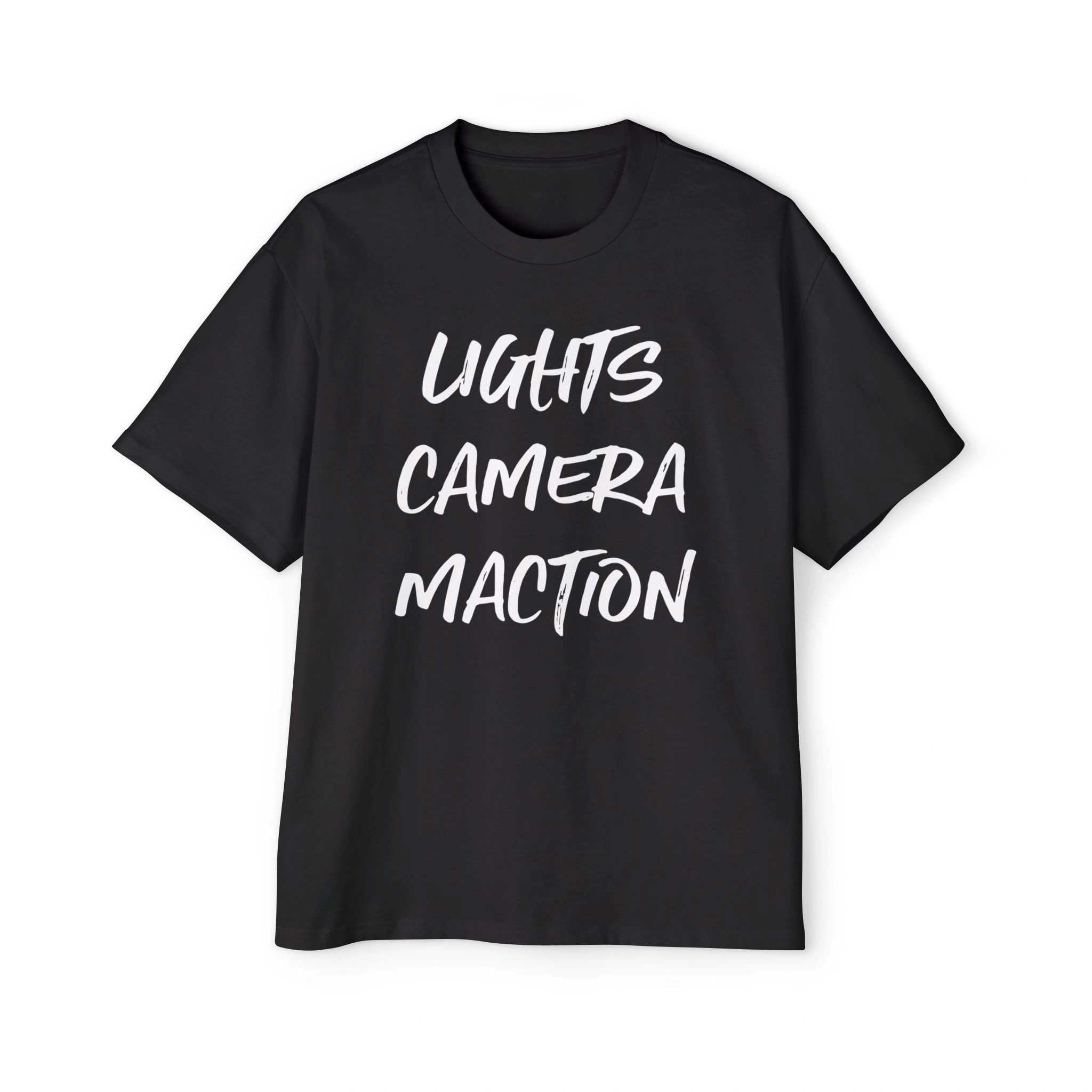 - Iconic, Bold Design: Features the “LIGHTS CAMERA MACTION” text in a clean, bold, white font that stands out against the classic black shirt.