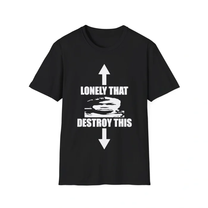 The design is simple but impossible to ignore: white text reading LONELY THAT DESTROY THIS flanked by bold arrows on a black tee. The high-contrast graphic pops in low light and reads clearly on stage, at shows, and in videos. It also stands out on the street. It’s the kind of shirt that says, “I know the joke, I own the joke.”, embodying the humor behind Lonely Destroy Shirt.