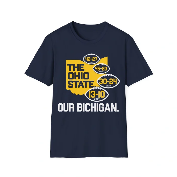 The Our Bichigan 2024 Shirt is a triumphant declaration of Michigan’s dominance in the ongoing rivalry with Ohio State. After another thrilling victory in 2024 with a nail-biting 13-10 score, this shirt humorously flips the script on the Buckeyes’ taunts. Featuring bold lettering that reads “Our Bichigan” alongside the scores of four consecutive victories from 2021 to 2024, this tee embodies Michigan’s pride and playful spirit.