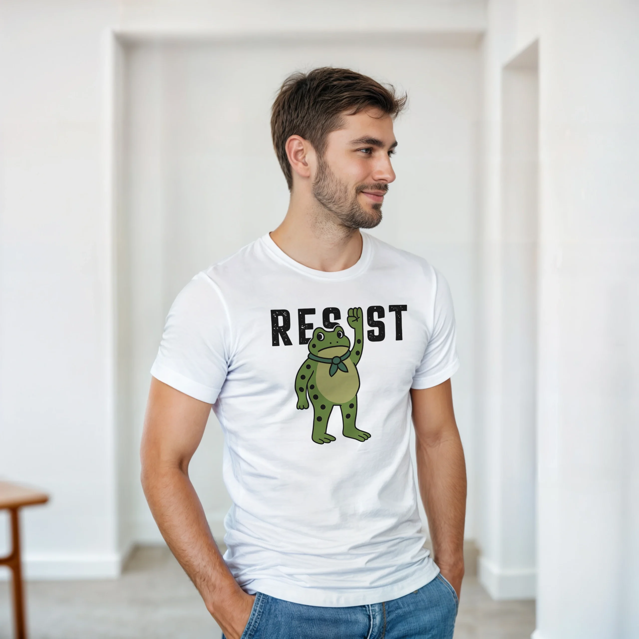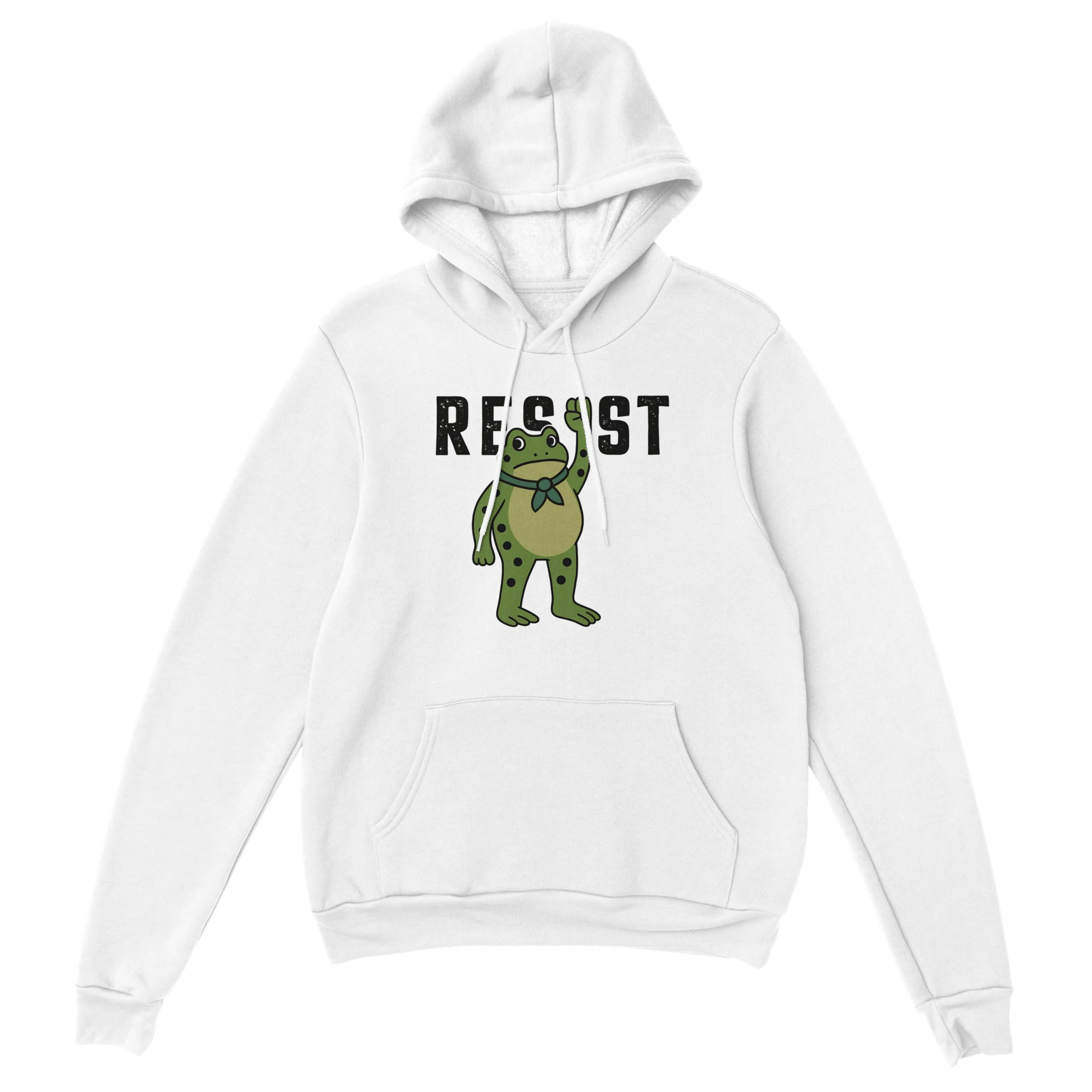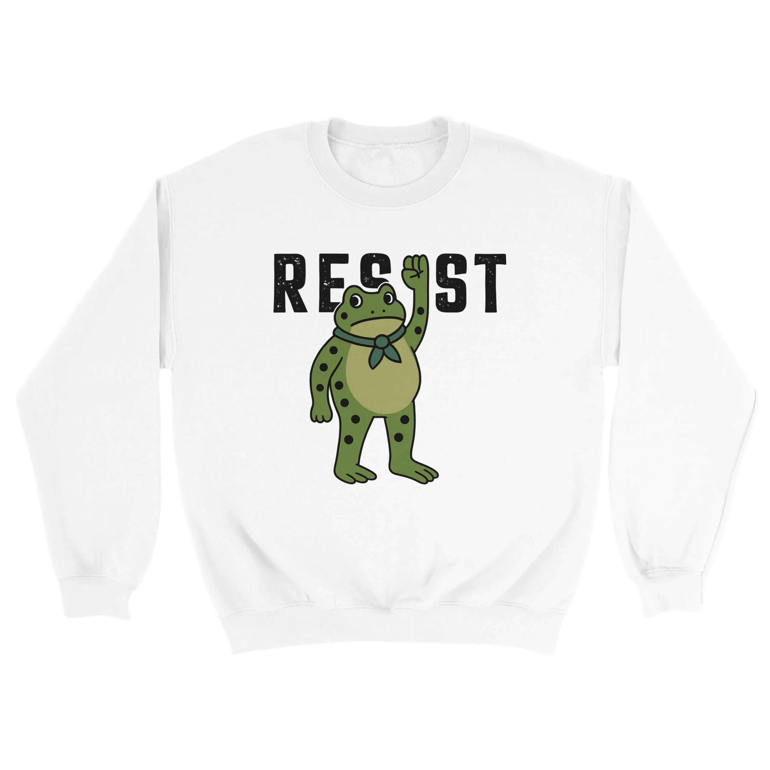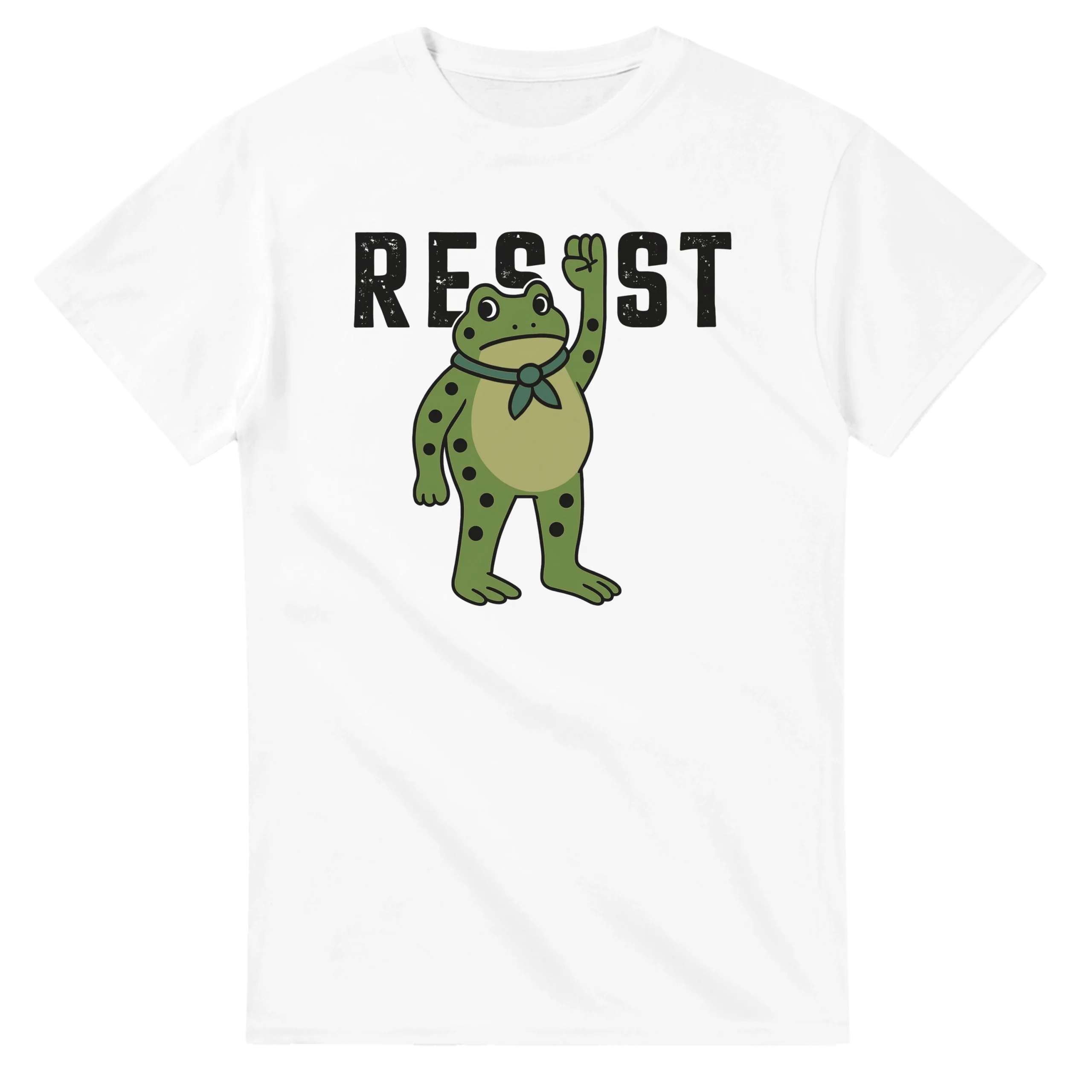 - Bold Graphic Design – Clear, fearless “RESIST” typography with frog art that stands out.