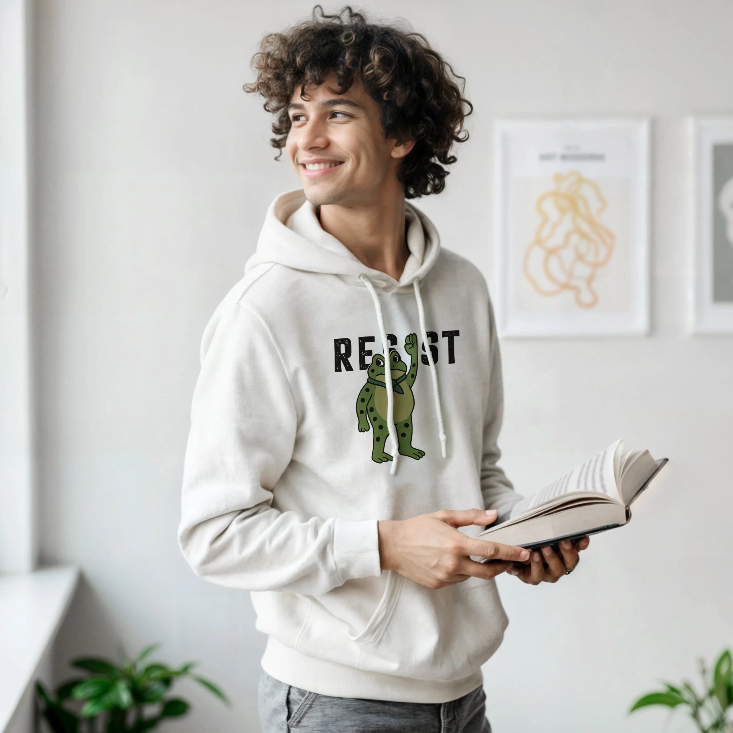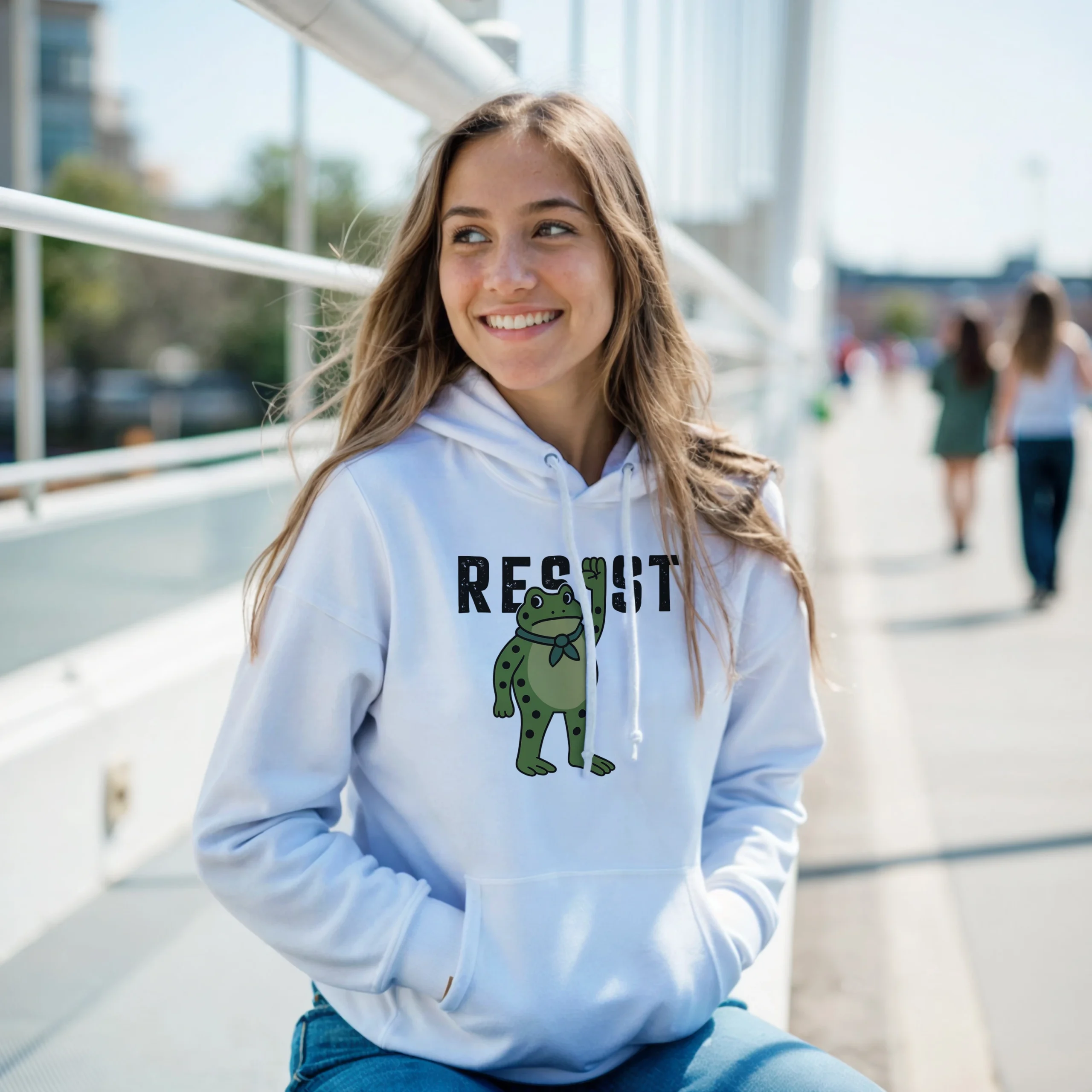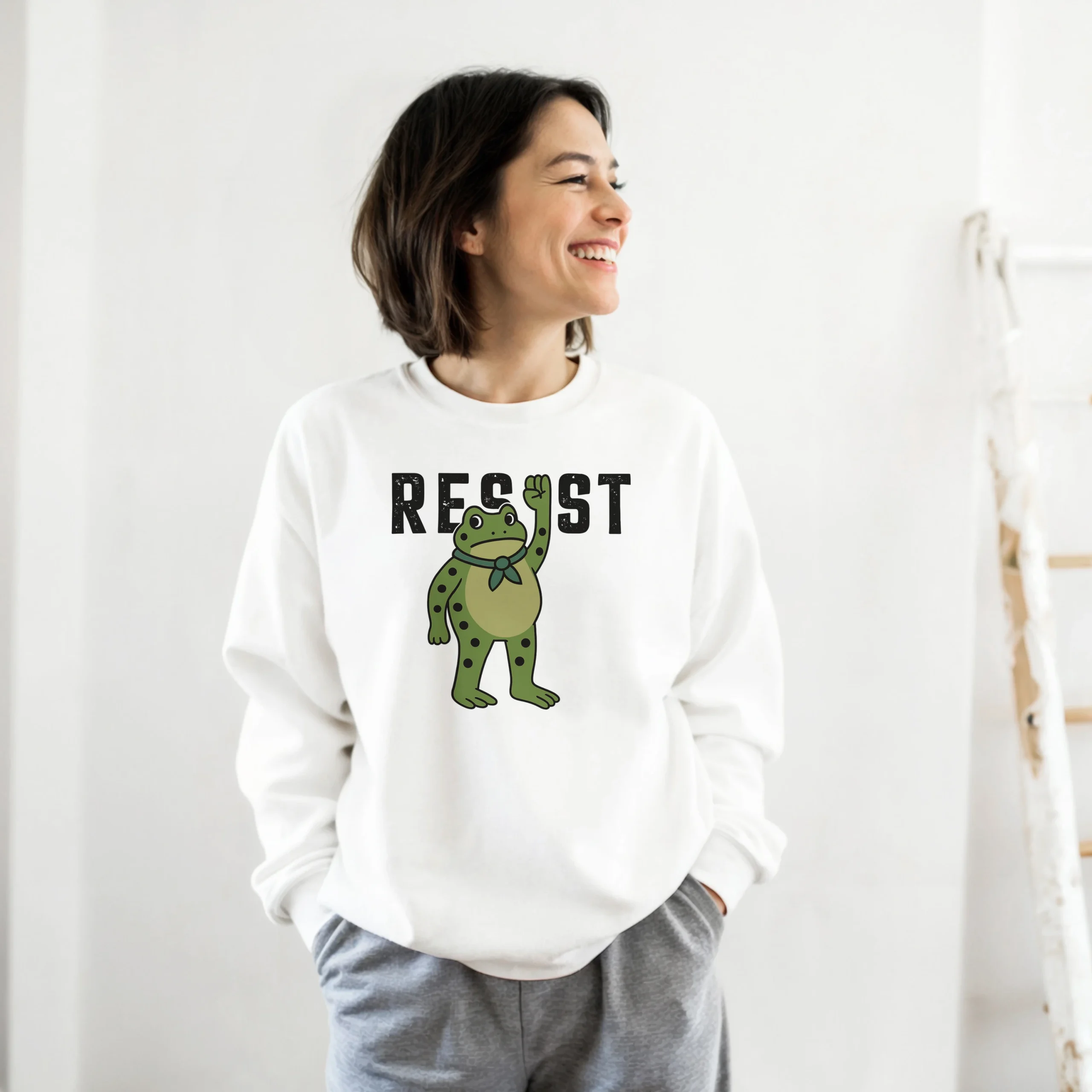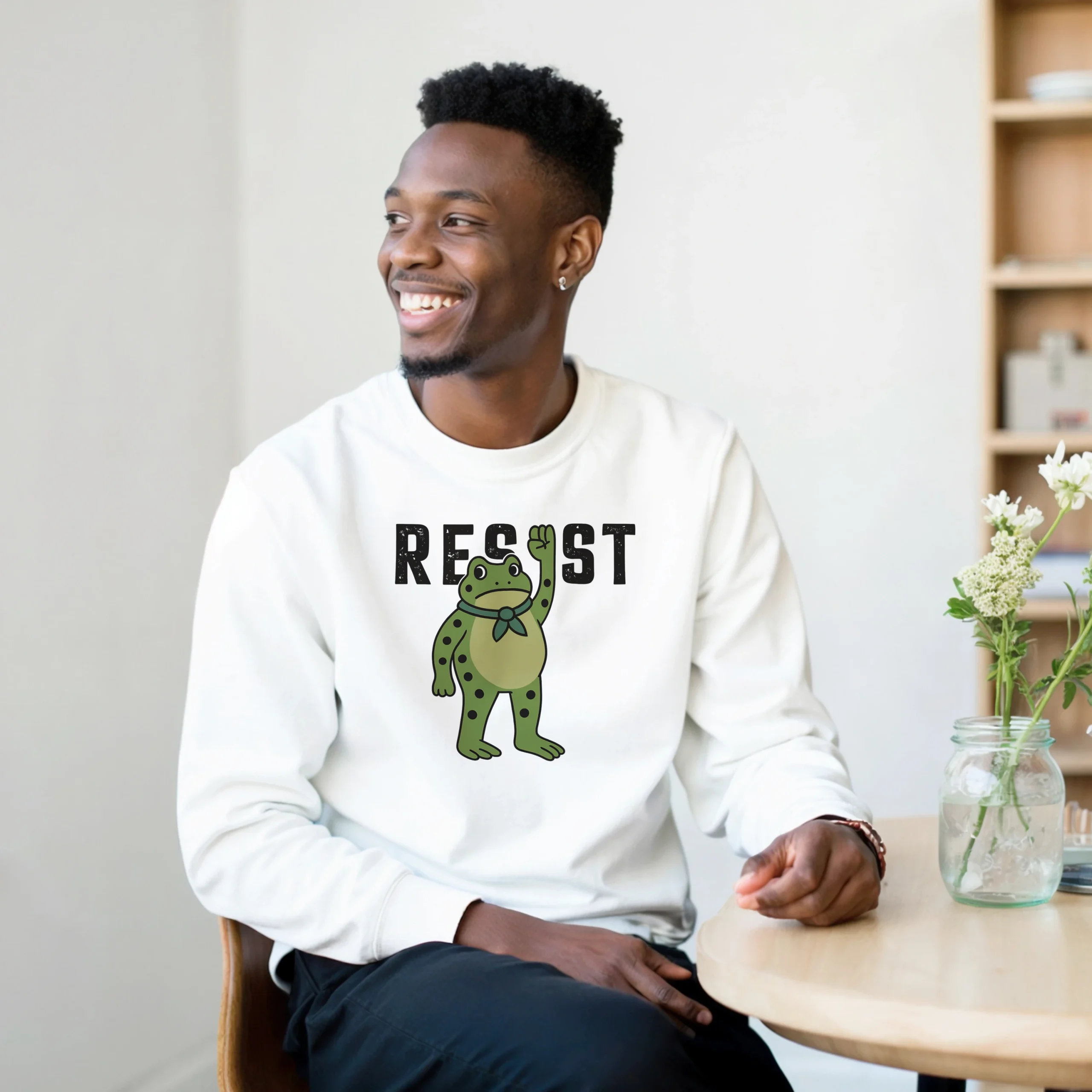 - Bold Graphic Design – Clear, fearless “RESIST” typography with frog art that stands out.