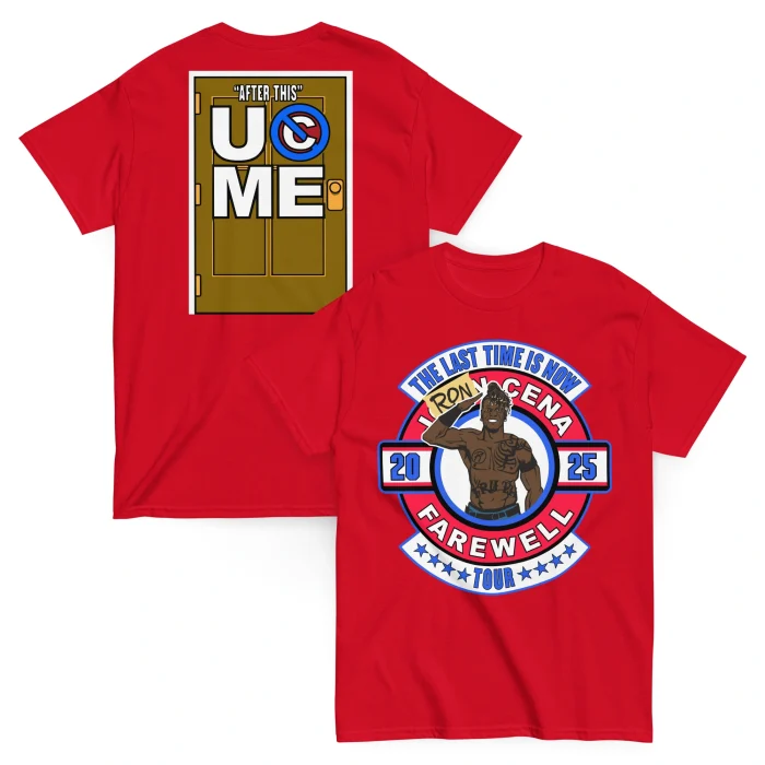 The back keeps the energy high. Oversized lettering reads “AFTER THIS U C ME,” mocking Cena’s classic line. It’s printed over a locker room backdrop with Ron’s nameplate lit up like a headline. Whether you saw the entrance live or caught the clip online, this shirt immortalizes one of WWE’s funniest crossovers.