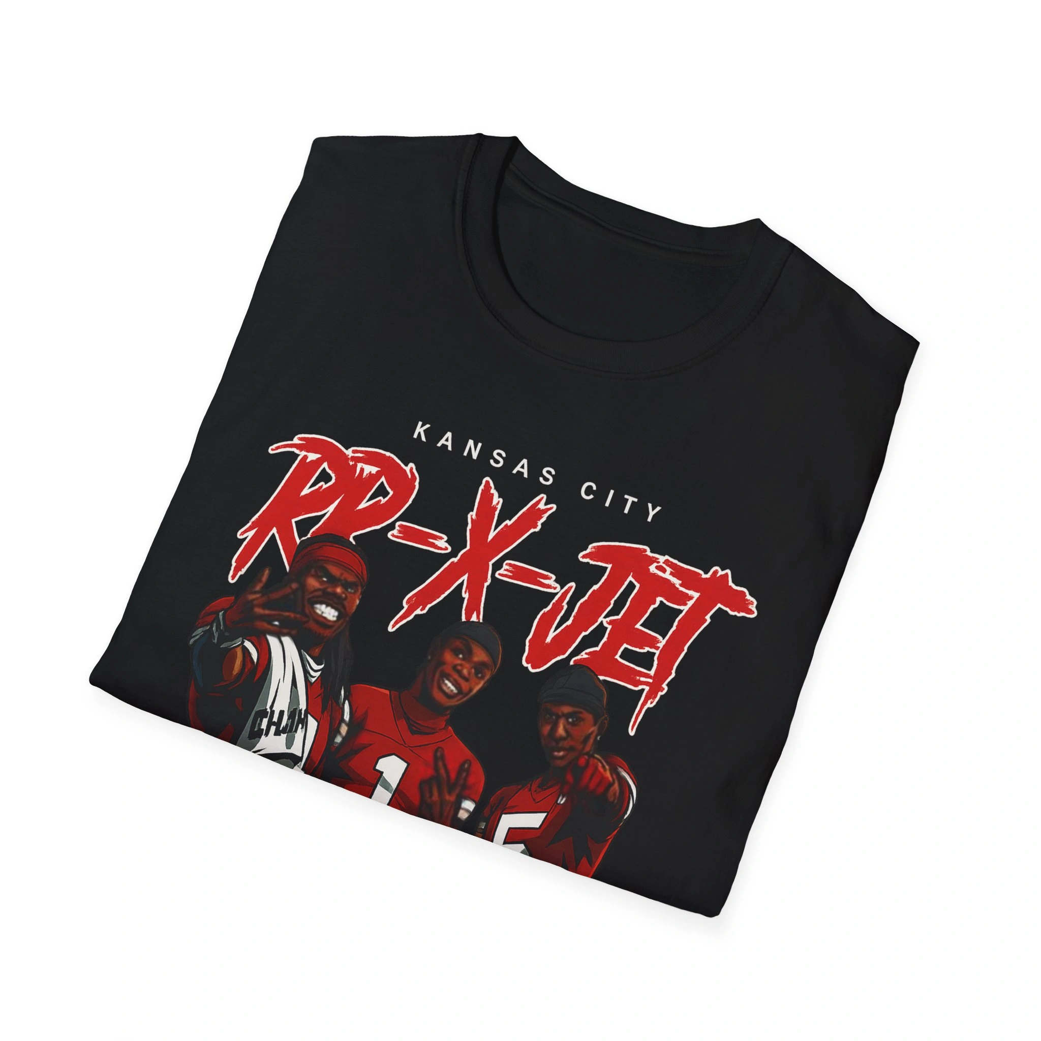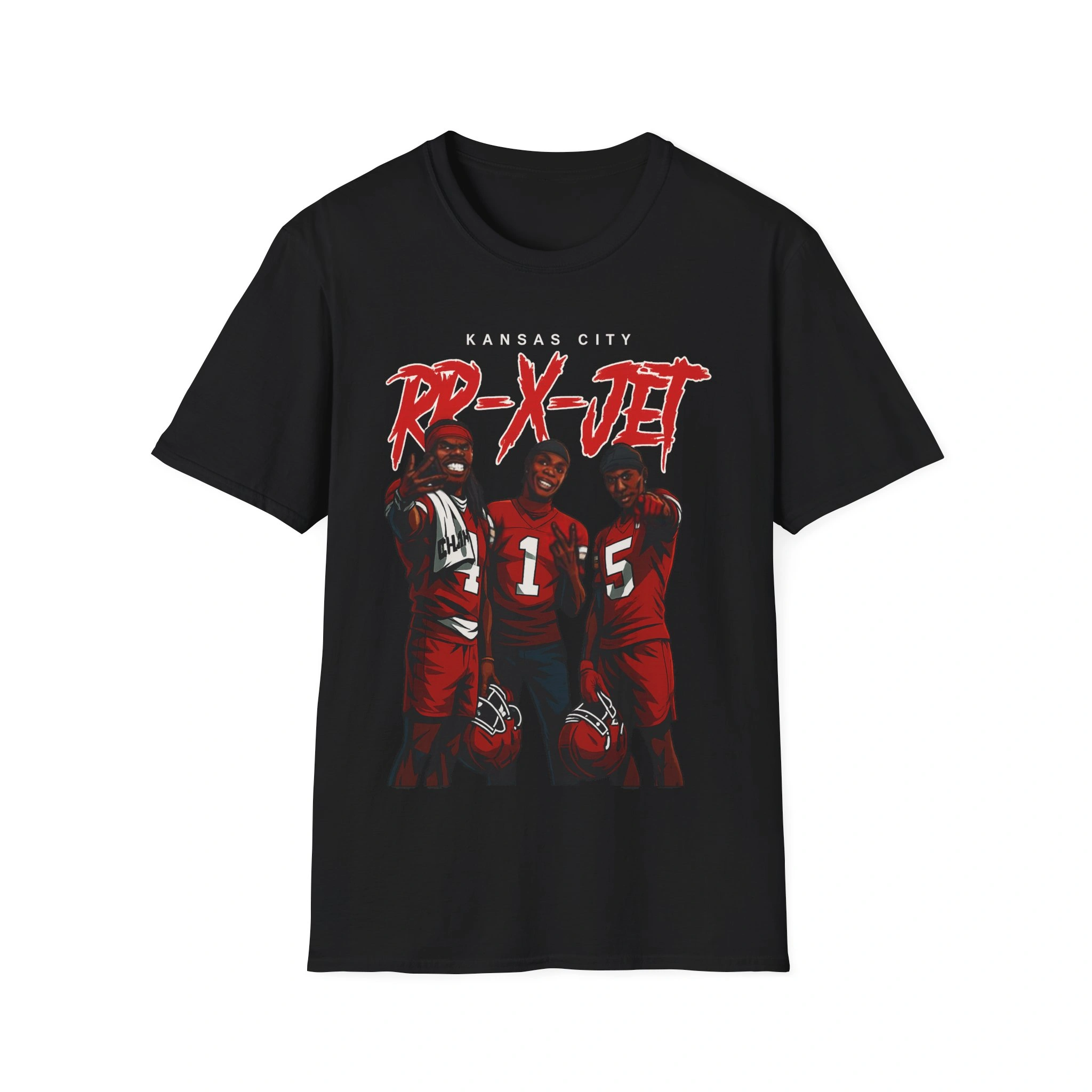 The artwork on the RR-X-JET Shirt says everything without needing explanation. It shows Rice, Brown, and Worthy suited up in their red and white, standing shoulder-to-shoulder, confidence radiating from every pose. Above them, the bold graffiti-style text “RR-X-JET” blazes across the chest in a high-energy font that feels like it was pulled straight out of a locker-room hype video. The Kansas City name sits on top in crisp white, sealing the look with pride.