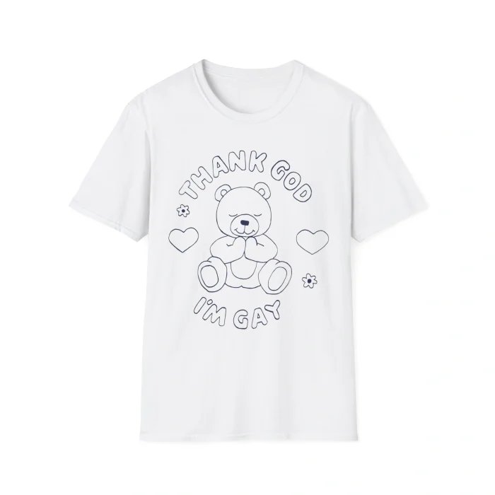 The Thank God I’m Gay Shirt is the perfect mix of sweet, proud, and iconic — a retro-style tee that became instantly recognizable after Lili Reinhart wore it in Hal & Harper. Featuring an adorable sketch-style teddy bear surrounded by hearts and flowers, this shirt delivers its message with a blend of humor, softness, and unapologetic self-love. It’s not just fashion — it’s identity, comfort, and queer joy wrapped into one effortlessly cool design.